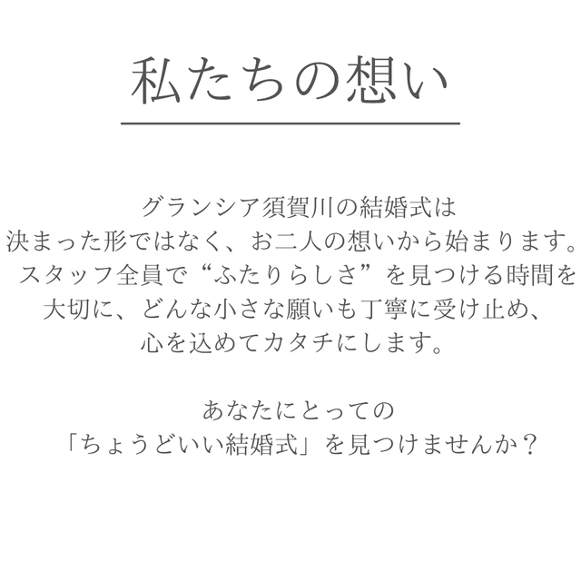 主役にならなくてもいい。大切な人と、自然体で過ごす。グランシア須賀川は、等身大の想いに寄り添う結婚式を大切にしています。