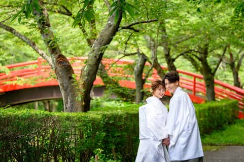 翠ケ丘公園のすぐそば。四季折々の自然に囲まれた中で、前撮り・フォト撮影にも最適。想い出の一日を美しい景色と共に残せます。